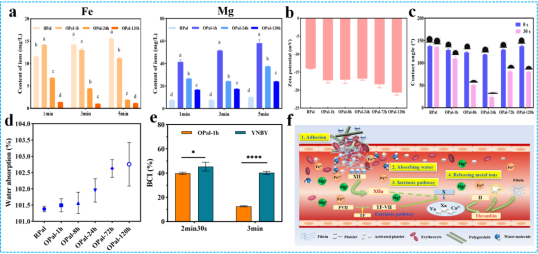 研究表明,隨著(zhù)草酸溶蝕時(shí)間的延長(cháng),凹凸棒石骨架中可釋放的Fe3+和Mg2+離子顯著(zhù)減少,表面電荷更負,接觸角顯著(zhù)下降后略有增加。溶蝕1h時(shí)較好地保留了止血過(guò)程所需的3價(jià)鐵離子和2價(jià)鎂離子,有利于加速凝血反應。