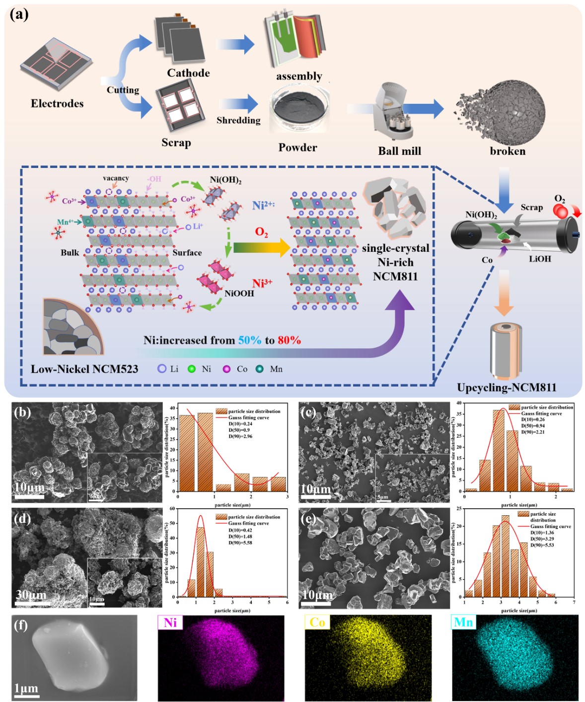 近日,中國科學(xué)院青海鹽湖研究所相變儲能課題組李翔副研究員提出一種針對低鎳、異質(zhì)三元正極混合廢料(如NCM523)的修復(fù)再生技術(shù),成功將其轉(zhuǎn)化為鎳梯度分布的單晶NCM811正極材料,實現(xiàn)了廢料的高值化利用與性能超越。該研究系統(tǒng)揭示了三元正極混合廢料在修復(fù)再生過程中的動態(tài)重構(gòu)路徑。研究發(fā)現(xiàn),由于混合廢料中不同尺寸顆粒在空氣中存儲時失效程度存在顯著差異,尤其是小粒徑顆粒更易受到空氣侵蝕,造成更深層次的晶格鋰損失和鹽巖相變,這為直接再生帶來巨大挑戰(zhàn)。團隊創(chuàng)新性地采用“簡單機械球磨+雙過渡金屬補償”相結(jié)合的策略,無需嚴(yán)苛條件與原料均一性要求,即可將來源多樣、粒徑不一的NCM523混合廢料,修復(fù)再生為富鎳單晶NCM811正極材料。研究結(jié)果表明,該再生單晶NCM811材料展現(xiàn)出卓越的電化學(xué)性能:在0.1C倍率下比容量高達202 mAh/g;在1C倍率下循環(huán)200次后容量保持率達到80.7%,剩余容量超過145 mAh/g;即便在5C高倍率下循環(huán)200次,容量保持率仍保持在79.4%以上,其倍率性能與循環(huán)穩(wěn)定性優(yōu)于市售商用單晶NCM811材料。同時,該材料有效抑制了H?→H?相變,進一步提升了材料結(jié)構(gòu)穩(wěn)定性和電池安全性。