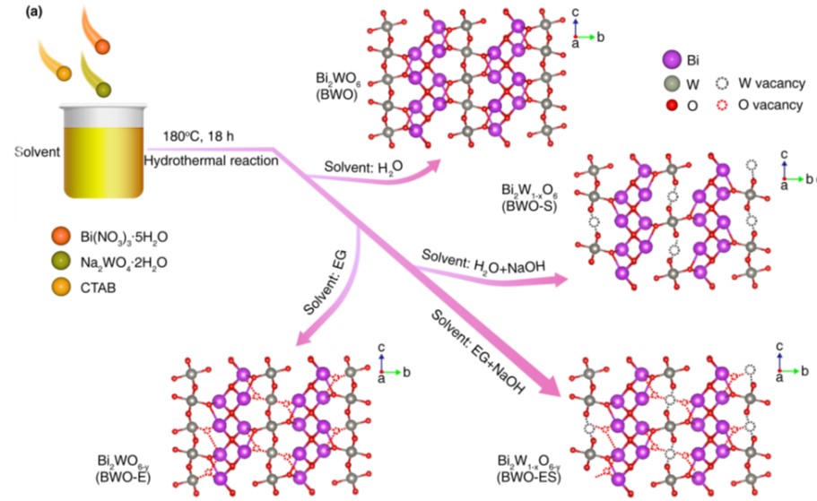 中國科學(xué)院青海鹽湖研究所輕合金與稀散元素分離課題組根據(jù)鉀鹽浮選藥劑性質(zhì)特點(diǎn),聚焦綠色高效處理的研究需要,結(jié)合高原地區(qū)自然光輻照強(qiáng)度大等優(yōu)勢,優(yōu)化光催化材料缺陷工程改性策略,成功制備金屬/非金屬雙缺陷鉍酸鹽光催化材料,考察其對可見光的吸收利用,并對雙缺陷結(jié)構(gòu)改性鉍酸鹽光催化劑的催化作用機(jī)制開展深入剖析。研究發(fā)現(xiàn),在水熱制備Bi2WO6過程中加入適當(dāng)比例的還原劑(EG)和刻蝕劑(NaOH),可以實(shí)現(xiàn)“一鍋法”在Bi2WO6納米片的中心和邊緣區(qū)域分別構(gòu)筑O缺陷和W缺陷,強(qiáng)化提升鉍酸鹽的催化性能。機(jī)理研究發(fā)現(xiàn):在雙缺陷結(jié)構(gòu)材料(BWO-ES)中,W缺陷作為負(fù)電荷中心,O缺陷充當(dāng)局部的正電荷中心。當(dāng)這些帶相反電荷的缺陷在晶格不同位置建立時(shí),使Bi2WO6材料的靜電偶極距由本體材料(BWO)的1.54 D提升至BWO-ES的48.15 D,促使材料的內(nèi)建電場強(qiáng)度提升2.74倍,為光生電子-空穴對的有效分離提供了內(nèi)部驅(qū)動力,從而抑制光生載流子的復(fù)合,表現(xiàn)的瞬態(tài)熒光壽命由BWO的1.61 ns提升至BWO-ES的2.63 ns。此外,O缺陷的構(gòu)筑降低了材料的帶隙(2.78 ev→2.54 eV),拓展了材料的光響應(yīng)范圍(446 nm→488 nm)。在可見光(λ≥400 nm)照射下,BWO-ES對十八胺(ODA)和十二烷基嗎啉(DMP)的降解速率分別達(dá)到13.31 mg/L·h和14.40 mg/L·h,是本體BWO材料降解速率的3.64倍和3.59倍,可實(shí)現(xiàn)鹽溶液中ODA、DMP的完全礦化。