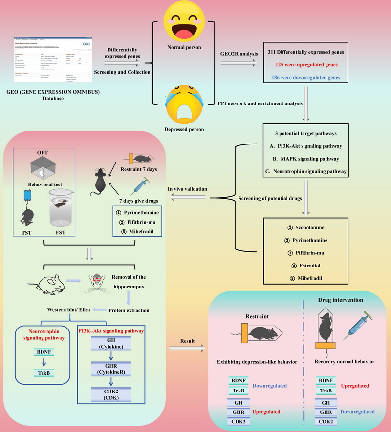 中國(guó)科學(xué)院西北高原生物研究所高原藏藥資源質(zhì)控與藥理毒理評(píng)價(jià)研究團(tuán)隊(duì)以抑郁癥患者基因表達(dá)數(shù)據(jù)為基礎(chǔ),先從GEO數(shù)據(jù)庫(kù)篩選出311個(gè)差異表達(dá)基因,經(jīng)加權(quán)基因共表達(dá)網(wǎng)絡(luò)分析、蛋白 - 蛋白相互作用網(wǎng)絡(luò)構(gòu)建及通路富集分析,發(fā)現(xiàn)這些基因主要富集于 PI3K-Akt、MAPK 和神經(jīng)營(yíng)養(yǎng)因子三大與抑郁癥發(fā)病相關(guān)的信號(hào)通路;隨后利用第二代 CMAP 平臺(tái),結(jié)合文獻(xiàn)調(diào)研篩選出3種候選小分子化合物(pyrimethamine,pifithrin-mu,mibefradil),通過分子對(duì)接實(shí)驗(yàn)驗(yàn)證,它們與上述通路關(guān)鍵蛋白(如 CDK2、TrkB 等)親和力高,部分滿足 “強(qiáng)結(jié)合” 標(biāo)準(zhǔn)(≤-7 kcal/mol);接著在慢性束縛應(yīng)激小鼠模型中驗(yàn)證 pyrimethamine,pifithrin-mu,mibefradil的抗抑郁效果,行為學(xué)測(cè)試(曠場(chǎng)試驗(yàn)、強(qiáng)迫游泳試驗(yàn)、懸尾試驗(yàn))顯示三者能顯著改善小鼠抑郁樣行為,效果與氟西汀相當(dāng);機(jī)制研究通過 Western blot 與 ELISA 實(shí)驗(yàn)證實(shí),三者可調(diào)控 PI3K-Akt 和神經(jīng)營(yíng)養(yǎng)因子通路關(guān)鍵蛋白表達(dá)(降低 GH、GHR、CDK2 異常高表達(dá),上調(diào) BDNF、TrkB 表達(dá)),Pearson 相關(guān)性分析驗(yàn)證了通路調(diào)控與抗抑郁效果的直接關(guān)聯(lián),同時(shí)該研究還證實(shí) “老藥新用” 策略在抗抑郁藥物研發(fā)中的高效性,并建立 “多數(shù)據(jù)庫(kù)整合 - 多組學(xué)分析 - 體內(nèi)外驗(yàn)證” 的框架,成功挖掘出 3 種具有抗抑郁潛力的小分子化合物,為抑郁癥治療提供新候選藥物及作用機(jī)制參考。