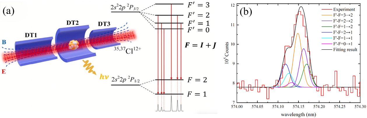 圖1. (a) SH-HtscEBIT中Cl12+離子的束縛態(tài)和發(fā)射態(tài)的能級圖,包括1??22??22??2P價態(tài)的超精細結構。超精細能級用總角動量F=I+J標記,核自旋??= 3∕2; (b) 類硼Cl12+離子的發(fā)射光譜,顯示基態(tài)1s22s22p 2P精細結構能級間的M1躍遷(含超精細結構)。黑色實線為擬合結果,彩色實線和虛線分別代表35Cl和37Cl的超精細結構譜線。