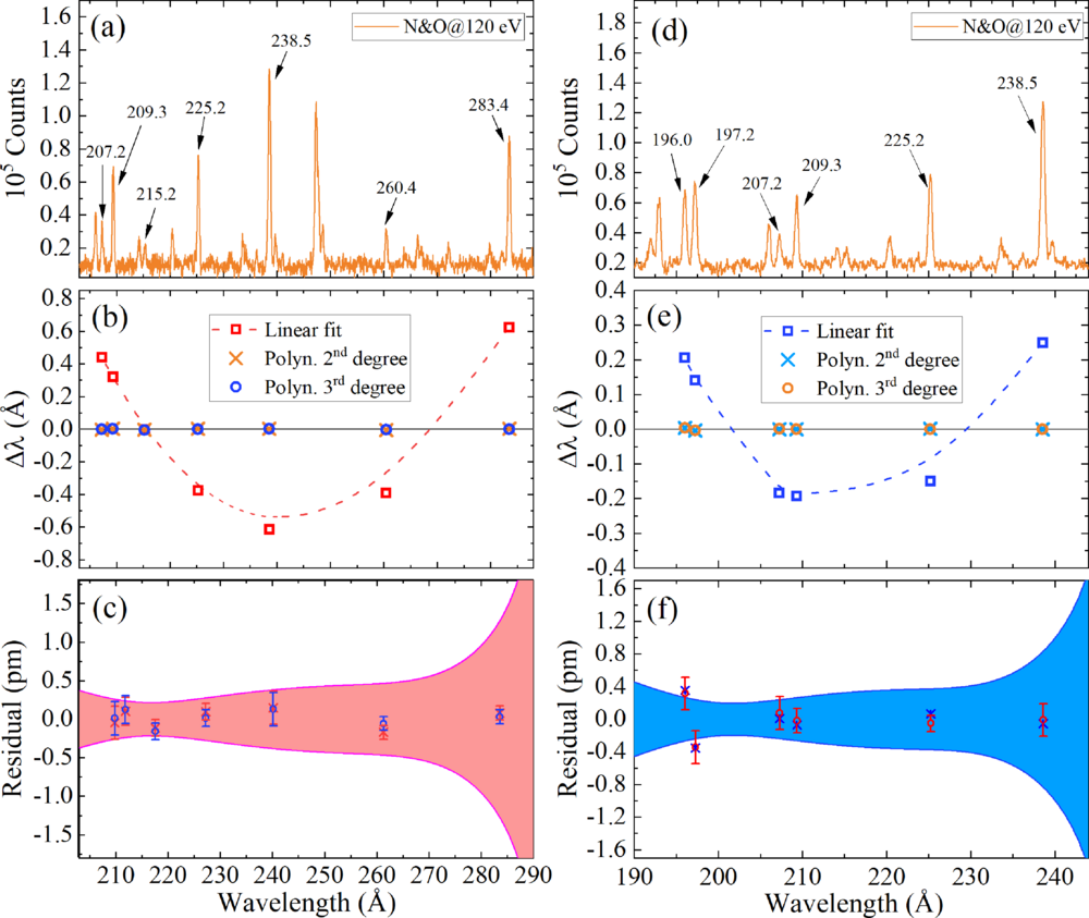 圖2. (a, d)分別為類鈹 S12+和Cl13+離子的??坦庾V;(b, d)分別為S12+和Cl13+離子的離子色散函數(shù)的殘差圖;(c, f) 為殘差放大圖和1-σ置信區(qū)間;