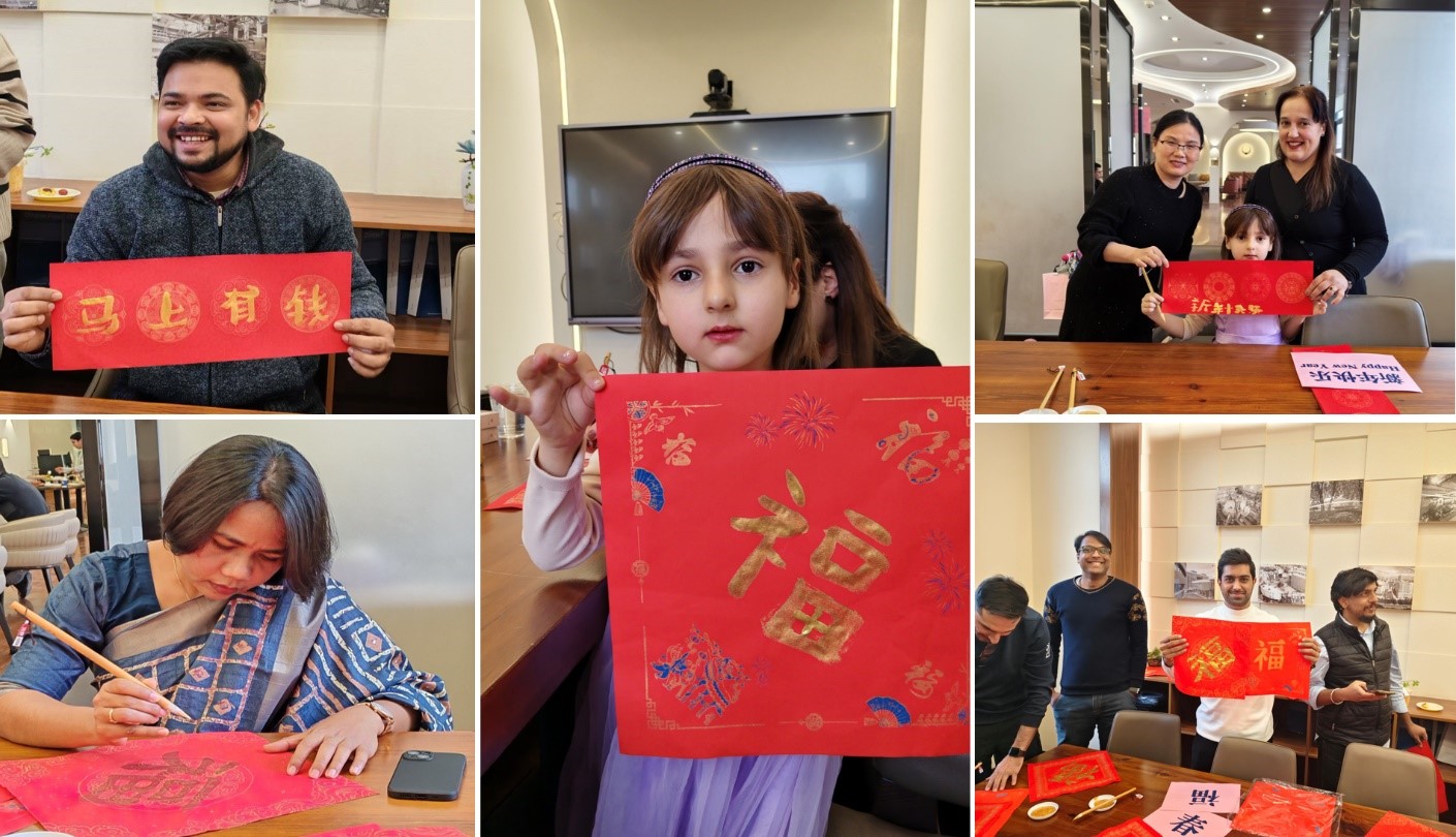 活動精彩紛呈,在充滿墨香的中國傳統(tǒng)書法體驗區(qū),外籍人員及家屬饒有興致地駐足打卡 “福字”、“對聯(lián)”書寫活動,一對對春聯(lián)、一個個福字躍然紙上,互道新年的美好祝福,近距離體驗中華傳統(tǒng)文化魅力。