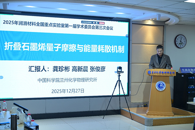 蘭州化物所所長、實驗室主任周峰研究員作了2025年度工作報告,全面梳理科研成果、平臺建設(shè)、人才引育、產(chǎn)業(yè)化等領(lǐng)域的成效,深入剖析現(xiàn)存問題與改進(jìn)思路,明確2026年工作重點與核心發(fā)展目標(biāo)。蔡美榮研究員、鮑路瑤副研究員、龔珍彬副研究員分別作了“固/介質(zhì)復(fù)合潤滑材料的空間環(huán)境效應(yīng)及在軌驗證研究”“潤滑油材料的高通量計算和人工智能設(shè)計”“折疊石墨烯量子摩擦與能量耗散機制”的學(xué)術(shù)報告。