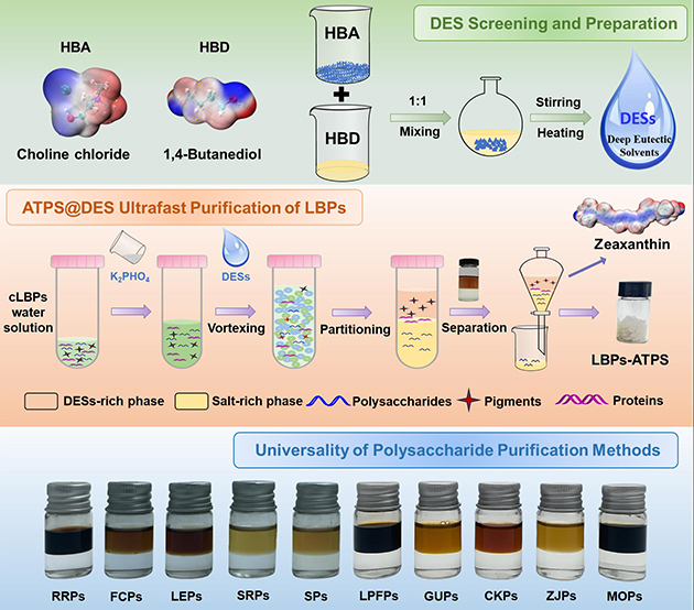 高效、精準(zhǔn)的分離純化是開展多糖精細(xì)結(jié)構(gòu)解析和活性研究的重大難題,而樣品前處理是多糖分離純化的重要基礎(chǔ)和前提。傳統(tǒng)多糖分離純化的樣品前處理技術(shù)包括脫脂、脫蛋白和脫色等過程,不僅操作繁雜、時(shí)間冗長,而且會導(dǎo)致多糖流失、結(jié)構(gòu)變化和活性失活等。針對上述問題,課題組提出了將低共熔溶劑(Deep Eutectic Solvents,DES)引入雙水相體系(Aqueous Two-Phase System,ATPS)的新思路,構(gòu)建了新型ATPS@DES多糖樣品前處理新體系,實(shí)現(xiàn)了枸杞多糖同步脫脂、脫蛋白和脫色;同時(shí),在此溫和、綠色的條件下,實(shí)現(xiàn)了枸杞多糖高保留率和最大程度保持多糖的原始結(jié)構(gòu)特征。